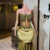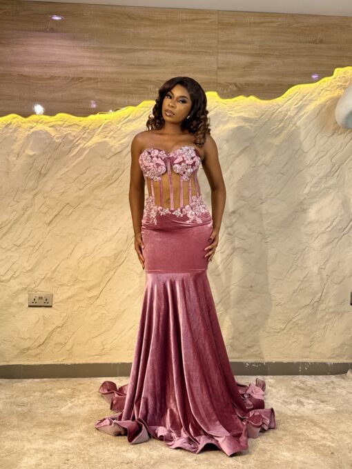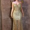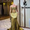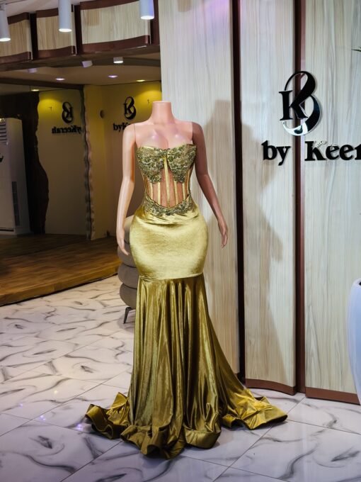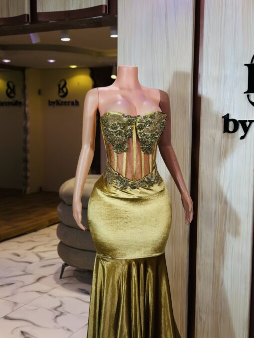 Ethereal Elegance: A luxurious floor length gold velvet dress . Make an unforgettable entrance in this breathtaking prom dress, customizable to your perfect fit .