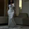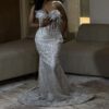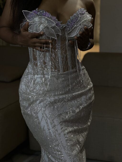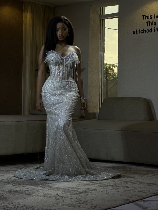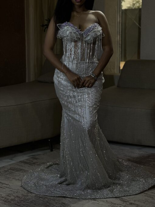 Ethereal Elegance: A luxurious Silver Dress. Make an unforgettable entrance in this breathtaking prom dress, customizable to your perfect fit .