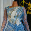 Make a statement with this stunning brocade dress, expertly crafted with intricate net long sleeves and a mesmerizing pattern of gold lines that cascade from the shoulder down to the belly button and sides.