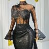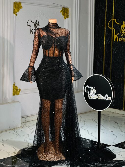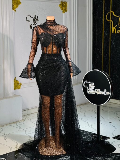 Ethereal Elegance: A beautiful black dress with a well crafted see through net. Make an unforgettable entrance in this breathtaking prom dress, customizable to your perfect fit .