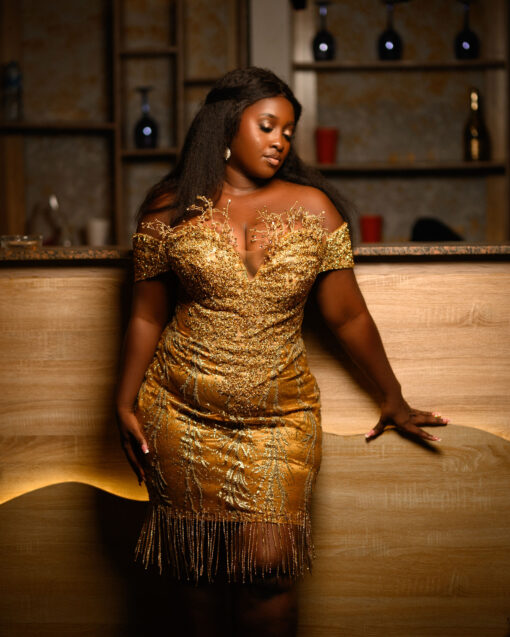 Ethereal Elegance: Customizable short gold dress. Make an unforgettable entrance in this breathtaking prom dress, customizable to your perfect fit .