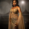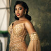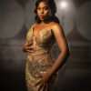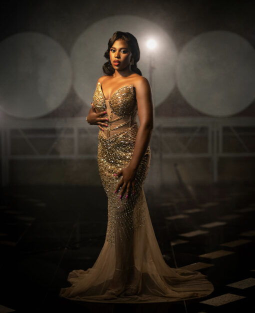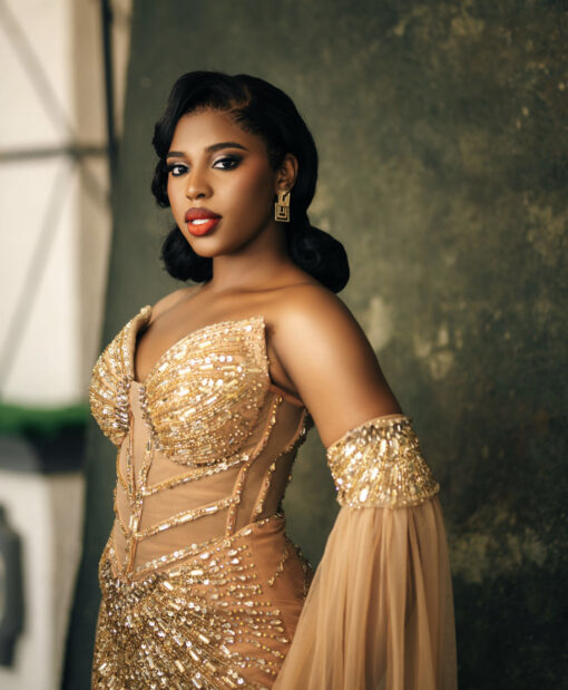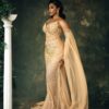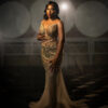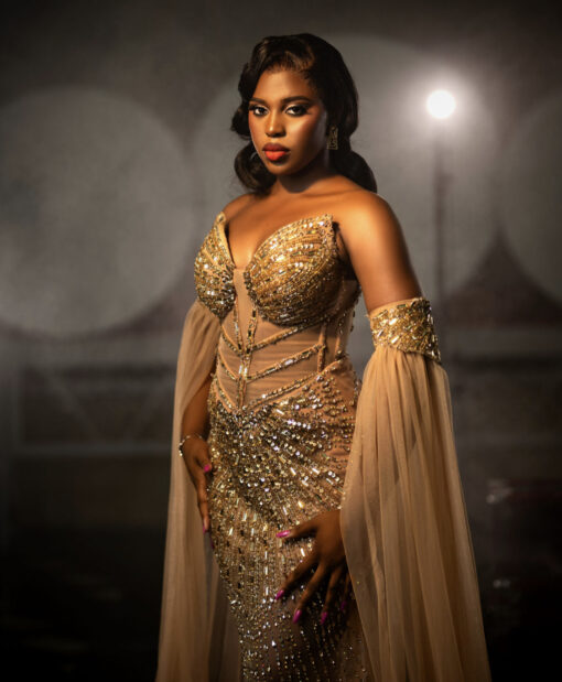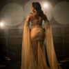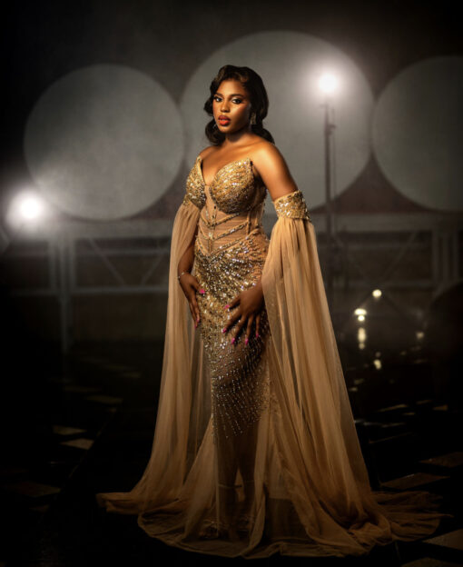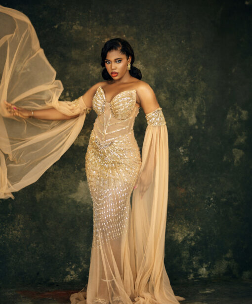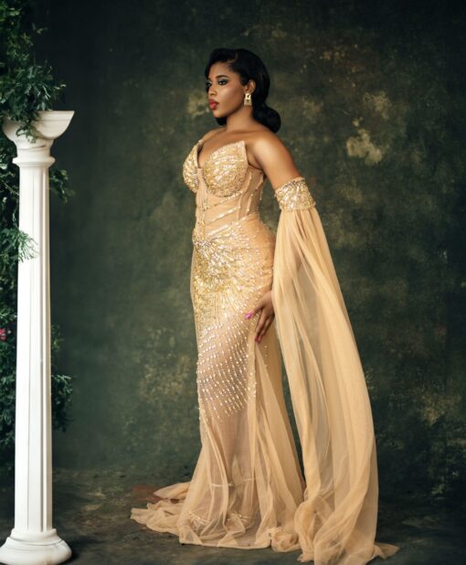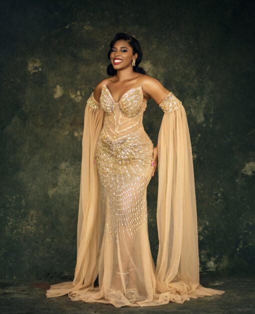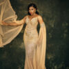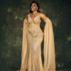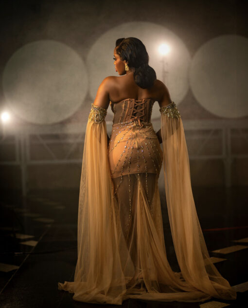 This dress is a stunning floor-length gown featuring an intricate beaded bodice that shimmers under light, creating a glamorous effect. The sheer, flowing cape sleeves attached at the upper arms add a dramatic and ethereal touch, while the fitted silhouette highlights elegance and sophistication. With its blend of delicate embellishments and graceful design, this gown is ideal for formal events or evening occasions, making a bold statement of luxury and refinement.