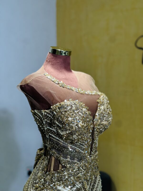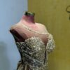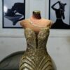 Step into a world of grandeur with this off-shoulder satin ball gown, featuring a structured bodice and sweeping skirt for an effortlessly regal appearance.