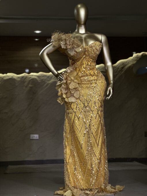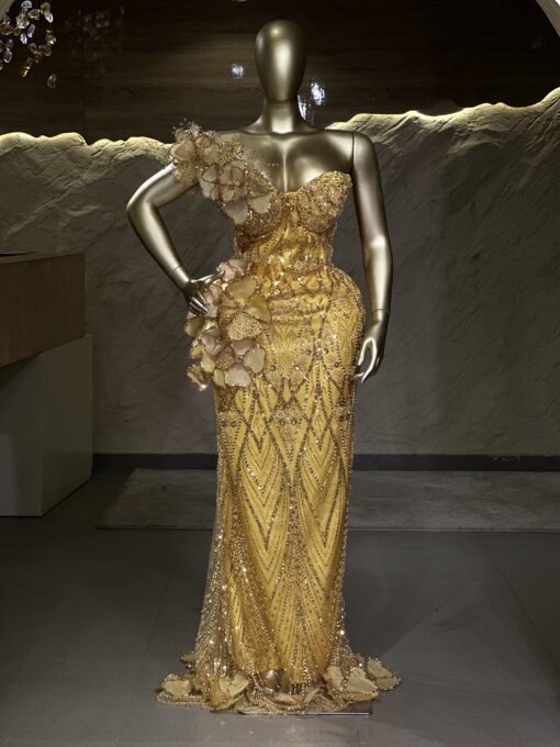 Experience the epitome of glamour and sophistication in this customizable prom dress. Contact us to discuss your color, fabric, and measurement preferences