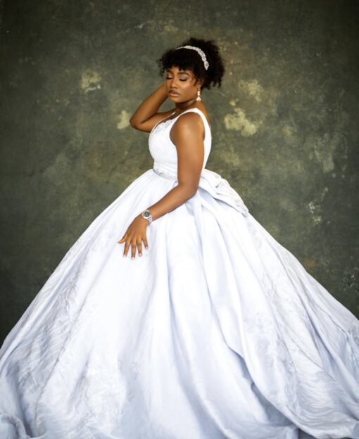 Charlotte, a show-stopping gown, ideal for formal occasions and red-carpet events. This luxurious piece is crafted with dazzling embellishments, adding elegance and sparkle. The gown features a fitted silhouette that enhances the figure, with a sophisticated neckline and intricate detailing for added allure. Designed to make a lasting impression, it combines timeless glamour with modern sophistication, making it perfect for anyone looking to exude confidence and poise.