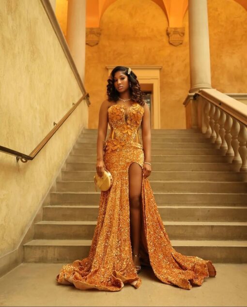 Ethereal Elegance: A breathtaking emerald Gold prom dress, featuring a bold high-slit and exquisite 3D floral accents. Make an unforgettable entrance in this breathtaking prom dress, customizable to your perfect fit.