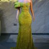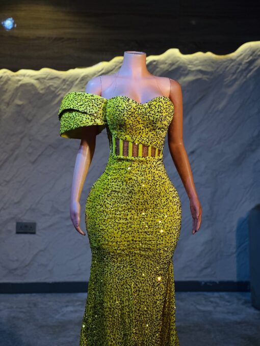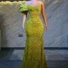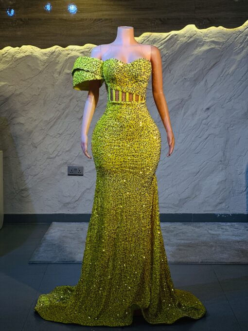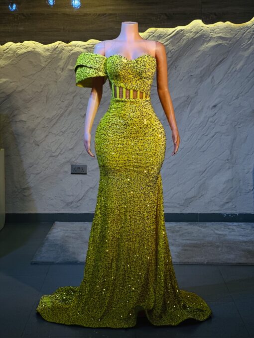 Ethereal Elegance: A luxurious yellow Dress with structured sleeves. Make an unforgettable entrance in this breathtaking prom dress, customizable to your perfect fit .