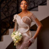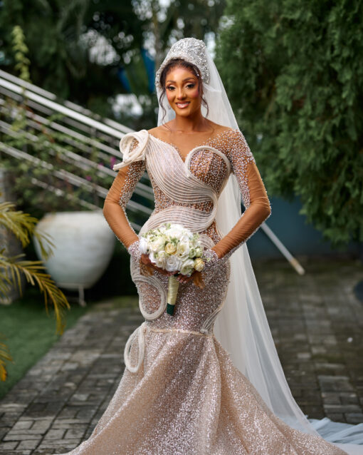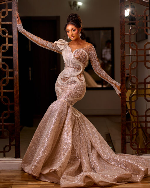 Enchanted bloom – Beaded Luxury Mermaid Lace bridal Gown A timeless mermaid silhouetteadorned with luxurious beaded lace and finished with layers of organdy fabric that flow into a graceful long tail. Elegant, radiant, and crafted for the bride who loves refined glamour.