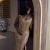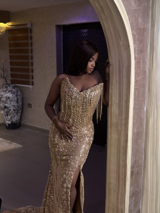 Ethereal Elegance: A luxurious well crafted dress with slit. Make an unforgettable entrance in this breathtaking prom dress, customizable to your perfect fit .