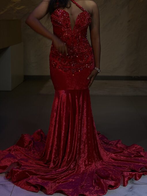 Ethereal Elegance: A luxurious Red Dress. Make an unforgettable entrance in this breathtaking prom dress, customizable to your perfect fit .