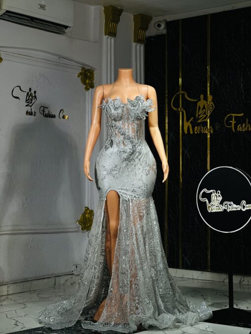 Ethereal Elegance: A luxurious see through sky blue dress with slit. Make an unforgettable entrance in this breathtaking prom dress, customizable to your perfect fit .