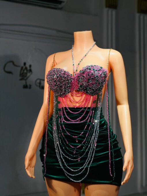 Unique top is intricately crafted with layers of glass beads in clear silver and blue tones draping beautifully across the bust in cascading rows