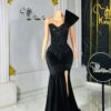 Ethereal Elegance: A luxurious black embellished velvet dress with high slit. Make an unforgettable entrance in this breathtaking prom dress, customizable to your perfect fit .