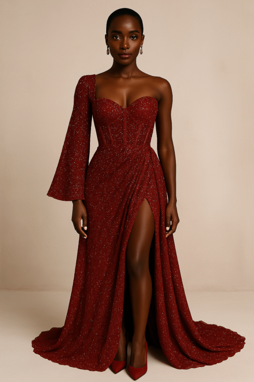 Ethereal Elegance: A wine luxurious floor length dress with front slit. Make an unforgettable entrance in this breathtaking prom dress, customizable to your perfect fit .