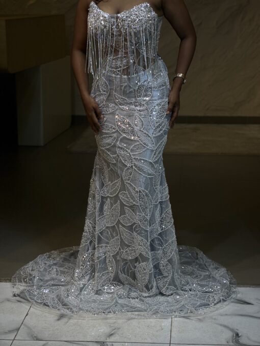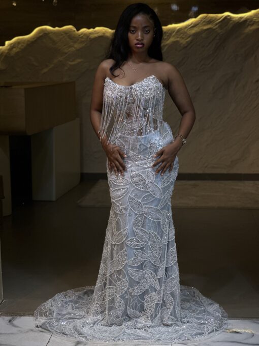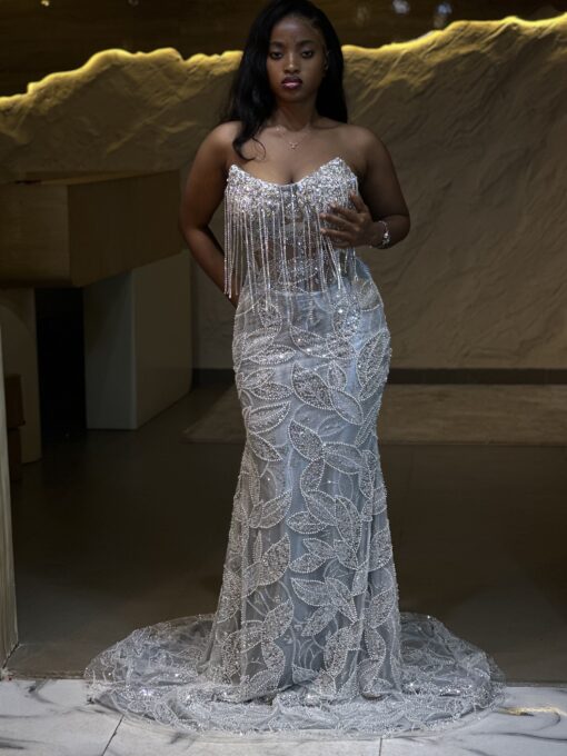 Experience the epitome of glamour and sophistication in this customizable prom dress. Contact us to discuss your color, fabric, and measurement preferences