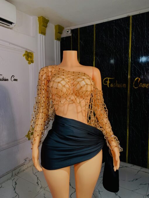 Elegant gold beaded long sleeve top. Turn heads in this stunning intricately hand beaded long sleeve top. Crafted with shimmering gold beads, this daring piece blends elegance with bold fashion. Perfect for fashion-forward event, photo shoots or styling over a corset or tube top for that rich edgy vibe