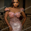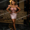 A feminine and enchanting mini dress with delicate floral appliqués on the bodice and a sweetheart neckline. The soft pink shimmer fabric offers a dreamy romantic feel for special occasions.
