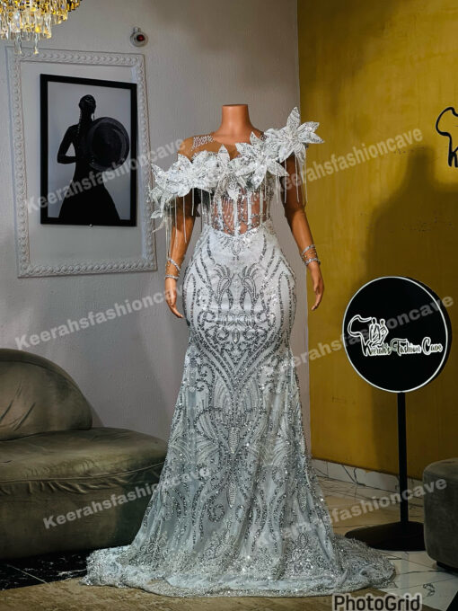 A high end luxury dress with exquisite floral patterned 3d designs, intricately decorated with cup chains. Available in custom sizes and colors.