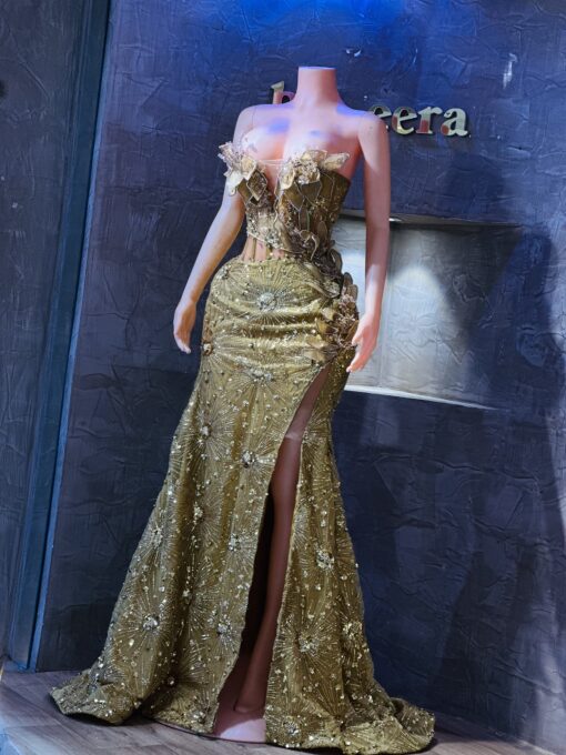 Experience the epitome of glamour and sophistication in this customizable prom dress. Contact us to discuss your color, fabric, and measurement preferences