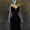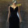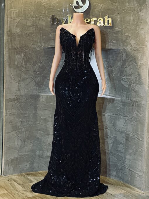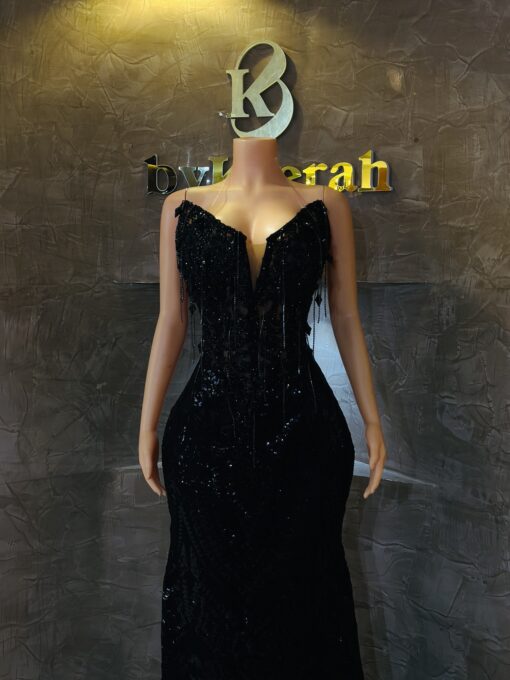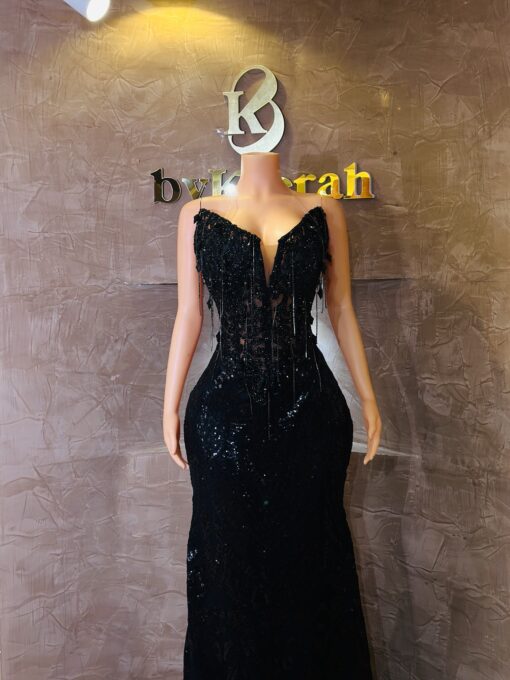 A stunning black luxury gown crafted with exquisite lace, a structured corset, and delicate dangling droplets that give it a rich, dramatic finish.