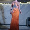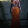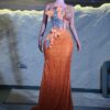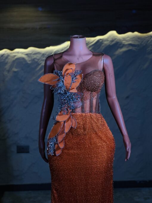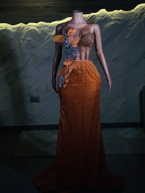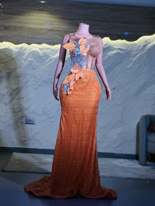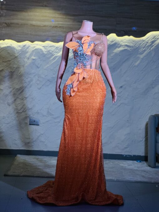 Ethereal Elegance: A luxurious Orange Dress with structured sleeves. Make an unforgettable entrance in this breathtaking prom dress, customizable to your perfect fit .