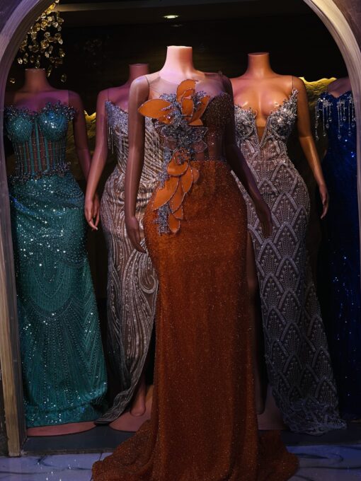 Experience the epitome of glamour and sophistication in this customizable prom dress. Contact us to discuss your color, fabric, and measurement preferences