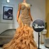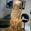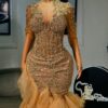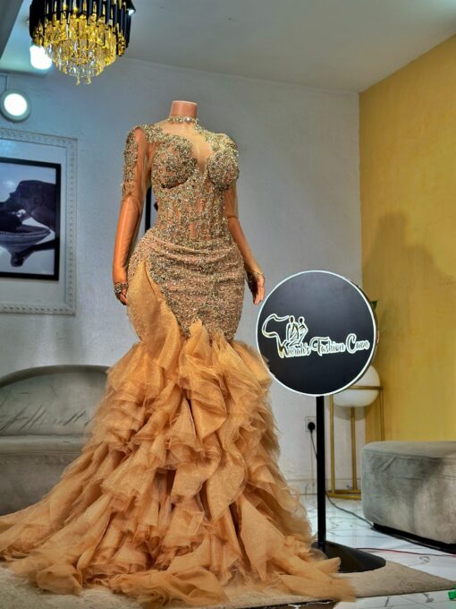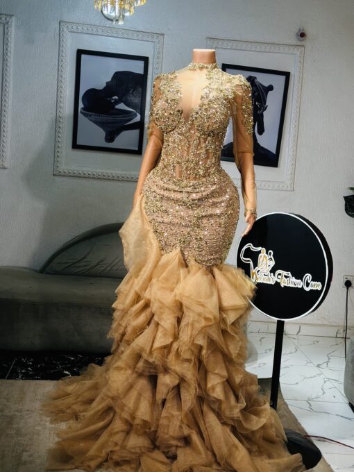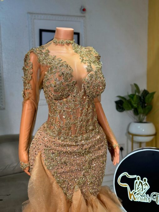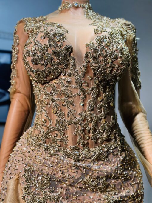Experience the epitome of glamour and sophistication in this customizable floor-length beaded lace prom dress. Contact us to discuss your color, fabric, and measurement preferences