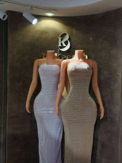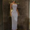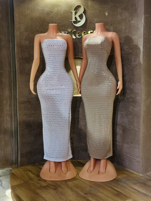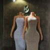 A sleek sleeveless rhinestone gown designed in a smooth, comfortable body-con silhouette that highlights the dress’s elegant shape. The sparkling rhinestones add the perfect touch of glamour for any special occasion.