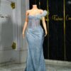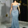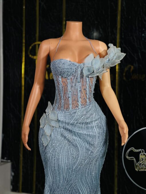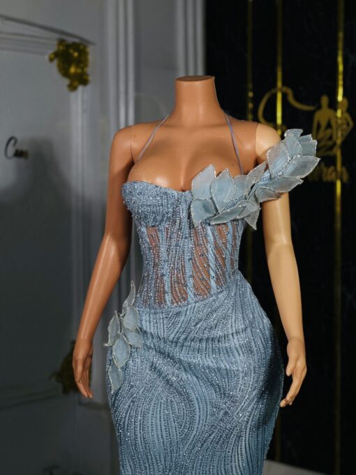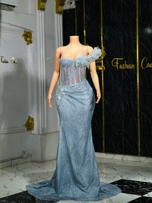 Ethereal Elegance: A luxurious sky blue dress with 3D. Make an unforgettable entrance in this breathtaking prom dress, customizable to your perfect fit .