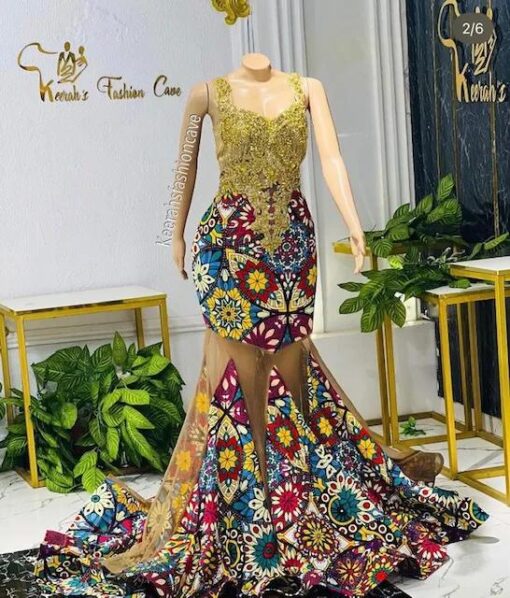 The bold, colorful print is inspired by traditional African designs, and the flowing, floor-sweeping silhouette is both elegant and comfortable. Whether you’re attending a special occasion or just want to add some flair to your everyday wardrobe, this dress is sure to turn heads.