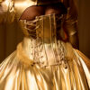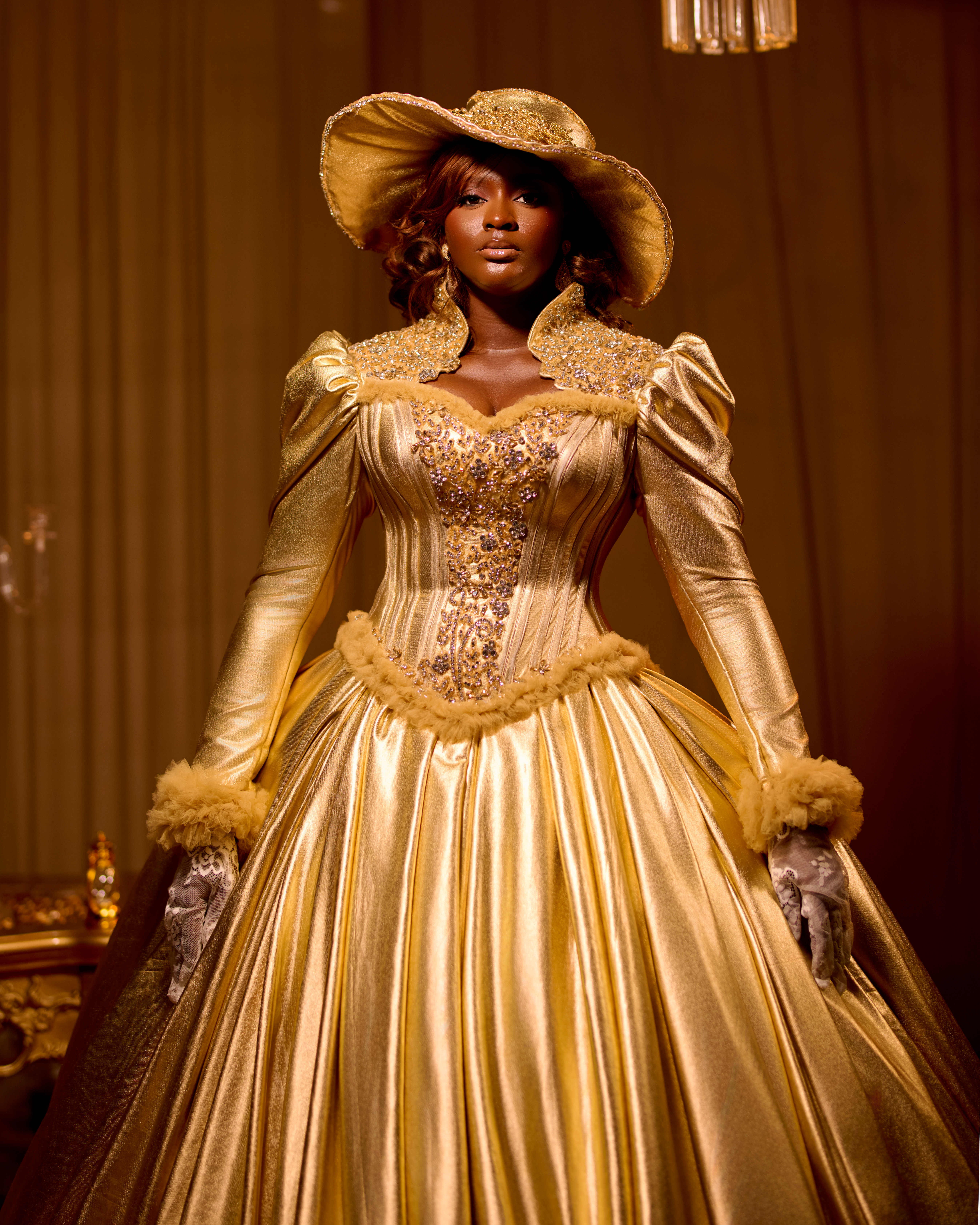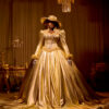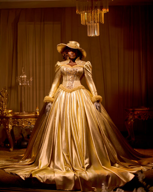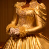 • The Silhouette: A massive, floor-sweeping bell skirt crafted from liquid Royal Gold fabric that captures the light of every rich chandelier.