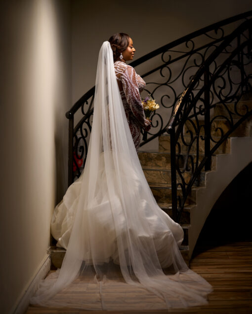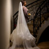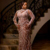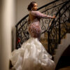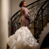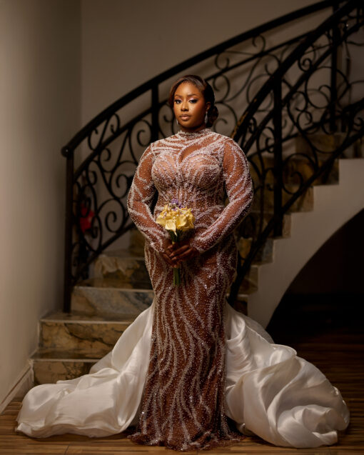 Victorian grace – Beaded Lace Wedding Gown with Detachable Trail. A stunning beaded lace masterpiece layered over nude skin-tone fabric for that flawless, radiant glow. Designed with a detachable white trail, giving you the perfect mix of elegance and comfort — dramatic for the aisle, sleek for the reception