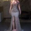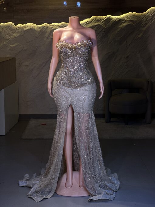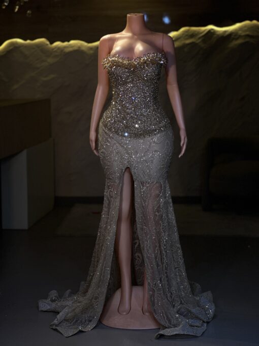 Experience the epitome of glamour and sophistication in this customizable prom dress. Contact us to discuss your color, fabric, and measurement preferences